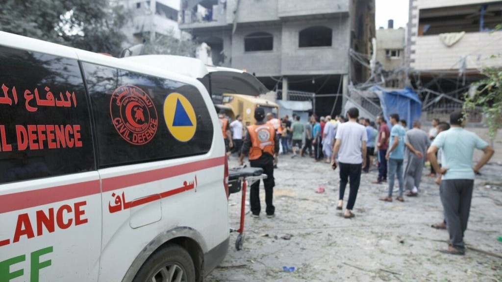 Bombeiros, juntamente com o pessoal da defesa civil, médicos na cidade de Gaza e outros membros da comunidade, unem forças para limpar os escombros de uma casa atingida pelas forças israelitas na área de Al Remal