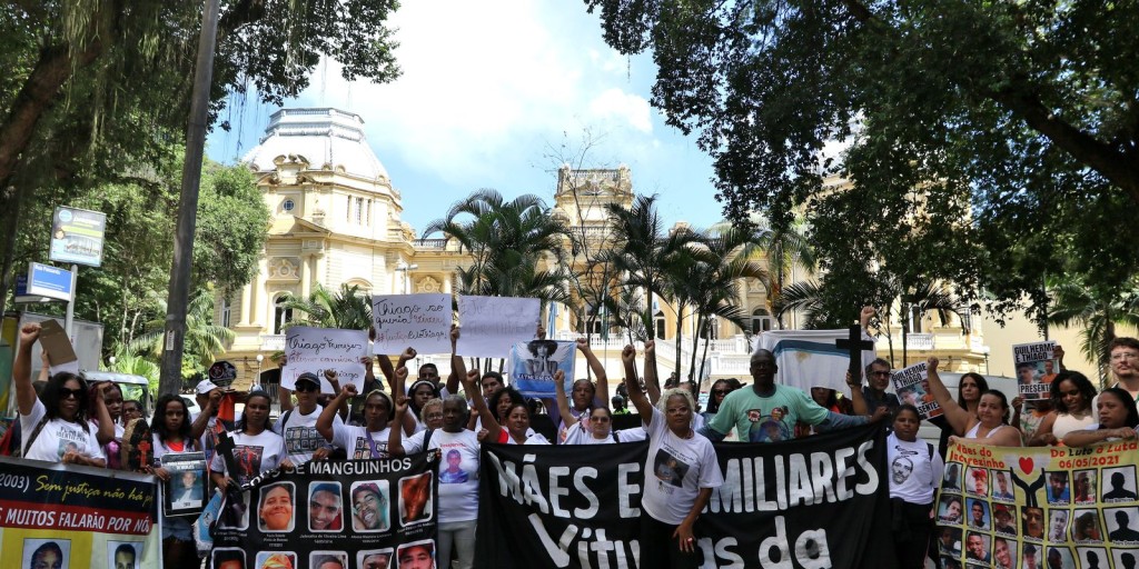 Mães e familiares de vítimas de violência policial no estado do Rio de Janeiro realizaram ato, nesta quinta-feira (17), em frente ao Palácio Guanabara, sede do governo do estado, localizado na zona sul da cidade do Rio.