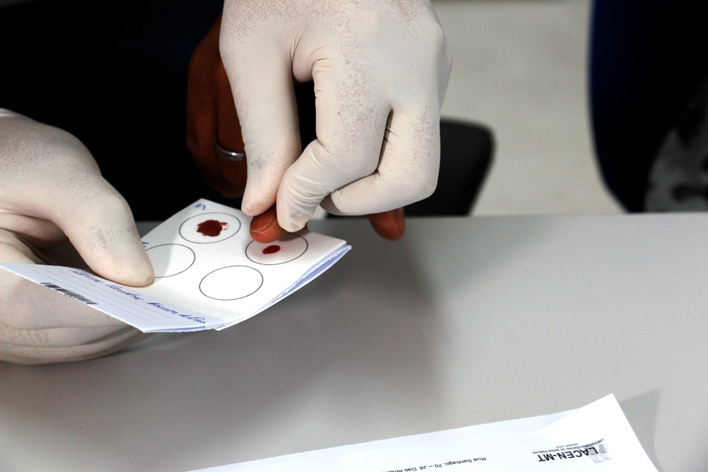 #Paratodosverem. Esta matéria possui recursos de texto alternativo para promover a inclusão das pessoas com deficiência visual. Foto 1: momento em que o material genético é colhido. No detalhe aparece um dedo, e uma gota de sangue que servirá de amostra para o exame de DNA.