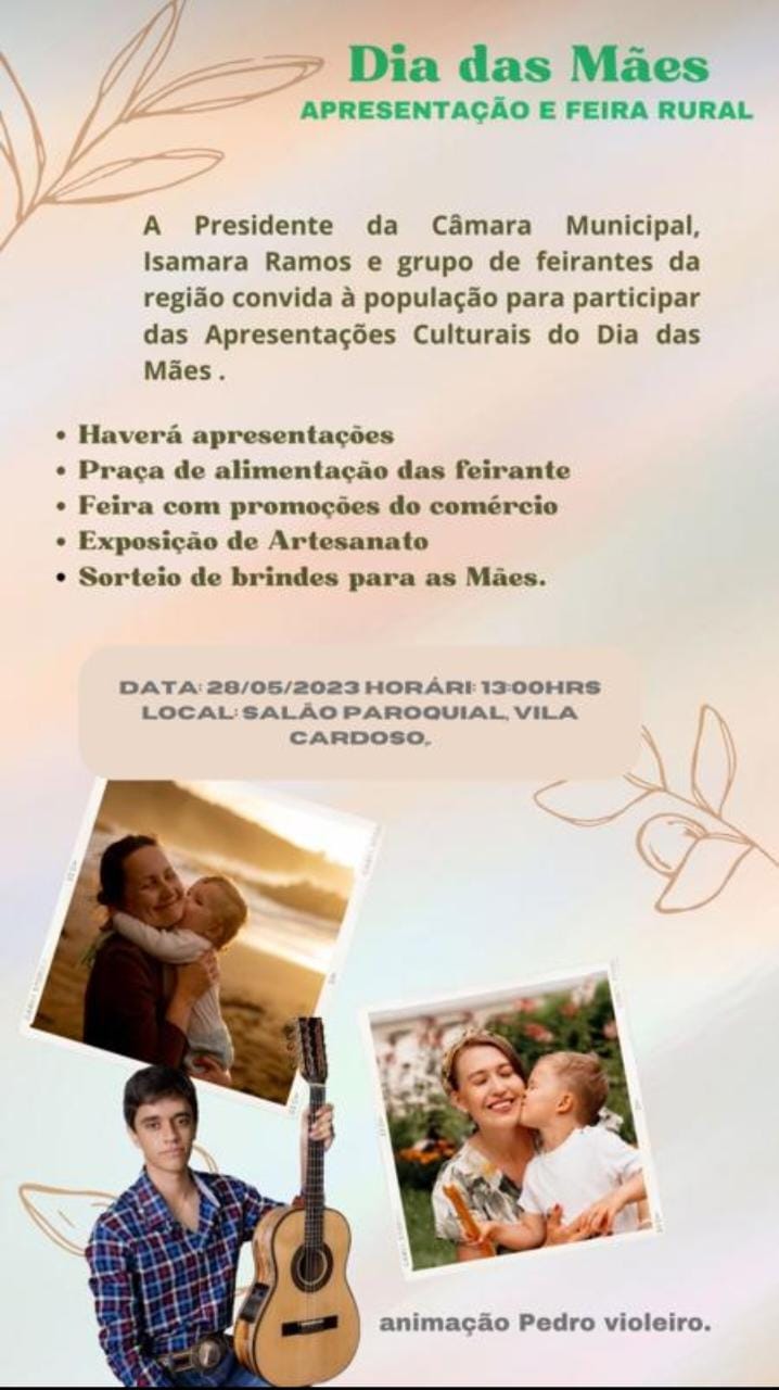 No próximo domingo, dia 28 de maio, a comunidade Vila Cardoso, em Porto Esperidião, se prepara para uma homenagem especial às mães. A presidente da Câmara Municipal, Isamara Ramos, junto com um grupo de feirantes da região, convida toda a população para participar das apresentações culturais e atividades da Feira Rural em manifestação ao Dia das Mães.