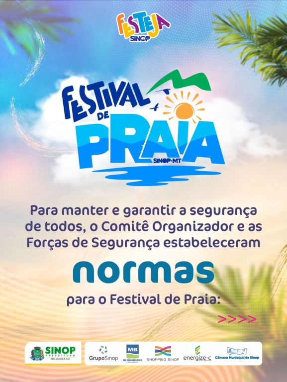 No ano em que Sinop completa 49 anos, a Prefeitura preparou o FESTEJA SINOP, com uma série de atividades voltadas para o bem-estar e entretenimento do cidadão. Dos grandes eventos, entre shows nacionais e desfile cívico, destacamos o Festival de Praia, evento que ocorrerá na praia do cortado, no rio Teles Pires. O Festival começa na quinta-feira, 7 de setembro, e segue pelos dias 9 e 10. Os três dias de festividade serão marcados pela acessibilidade, segurança e atração cultural a nível nacional com Joelma, no dia 10 de setembro.