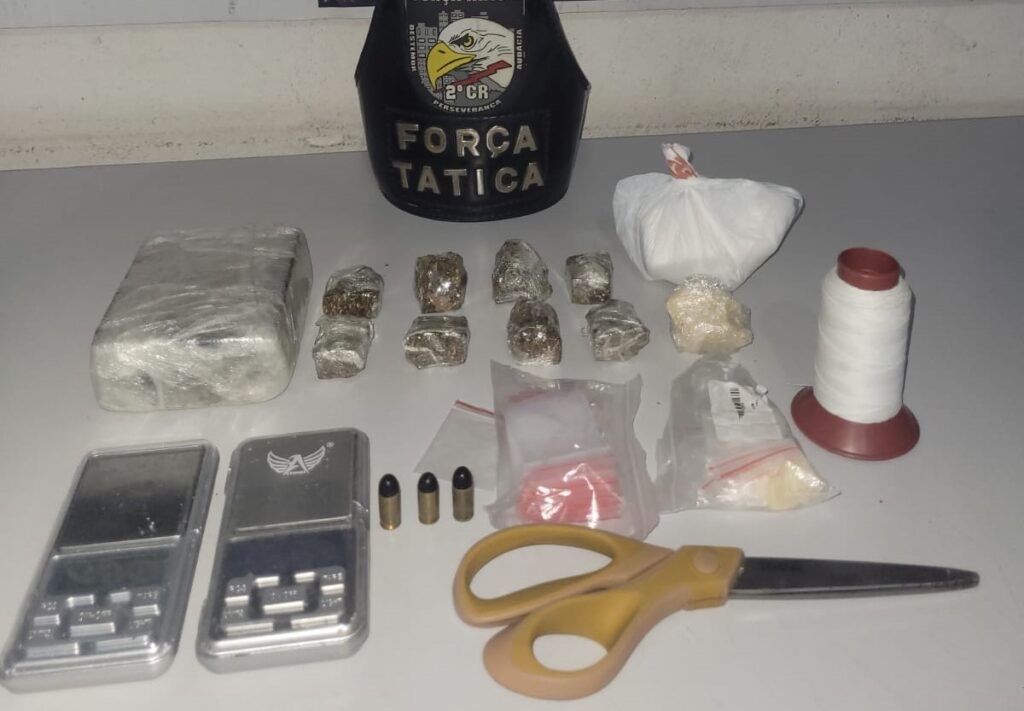 Os policiais seguiram ao endereço e encontraram três suspeitos, que fugiram para uma região de mata. Nas buscas, dois homens foram encontrados enquanto tentavam entrar em um veículo de transporte por aplicativo. A dupla estava com uma sacola contendo porções de drogas e uma arma de fogo artesanal.