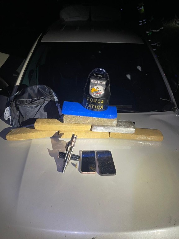 Policiais militares da Força Tática do 1º Comando Regional apreenderam sete tabletes de maconha e uma arma de fogo, em Santo Antônio do Leverger, na madrugada desta quarta-feira (25.10).