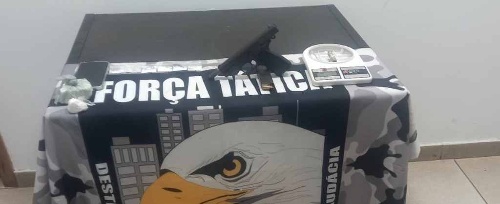 As equipes apreenderam uma motocicleta com documento adulterado, porções de entorpecentes, uma arma de fogo e munições.