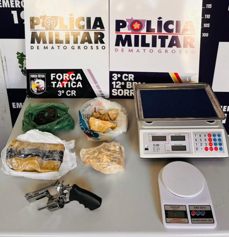 Equipes militares da Força Tática, do 3º Comando Regional da Polícia Militar, apreenderam uma arma de fogo, munições e 1,4 quilo de entorpecentes em uma abordagem, nesta quinta-feira (12.3), no município de Sorriso (400 km de Cuiabá). Um homem, de 20 anos, foi preso em flagrante suspeito por tráfico de drogas e porte ilegal de arma de fogo. Ele foi localizado com auxílio do Vigia Mais MT.