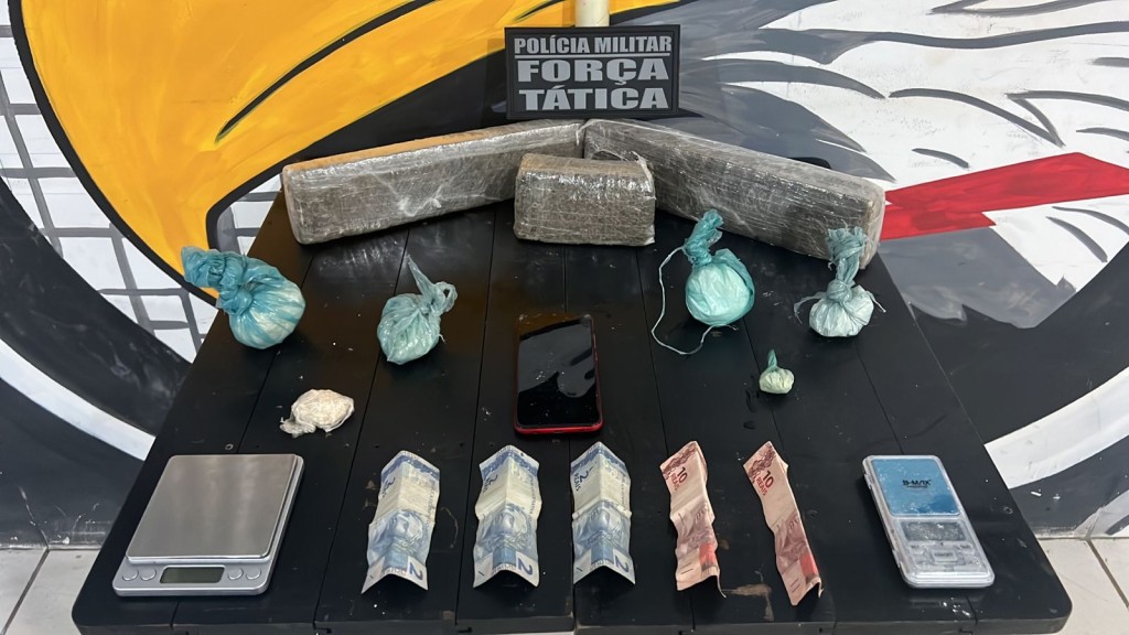 A equipe da Força Tática conseguiu encontrar e apreender três tabletes de maconha e quatro porções grandes de pasta base de cocaína, além de duas balanças de precisão.