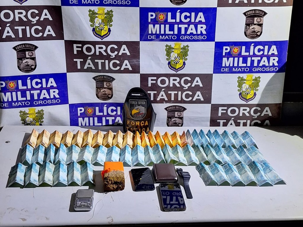 Abordado, o suspeito danificou um aparelho celular ao descer do carro. Em seus bolsos, a equipe encontrou a quantia de R$ 4.730,00 em dinheiro. Já em vistoria veicular, a PM localizou meio tablete de maconha e uma balança de precisão, debaixo do banco do motorista.