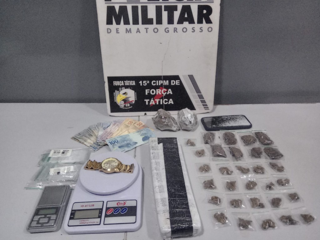 Um homem de 23 anos foi preso por tráfico de drogas pela Polícia Militar, na noite desta terça-feira (07.05), em Várzea Grande. O suspeito foi detido em flagrante pela Força Tática do 2º Comando Regional que, na ação, apreendeu um tablete e 32 porções de substância análoga a maconha.