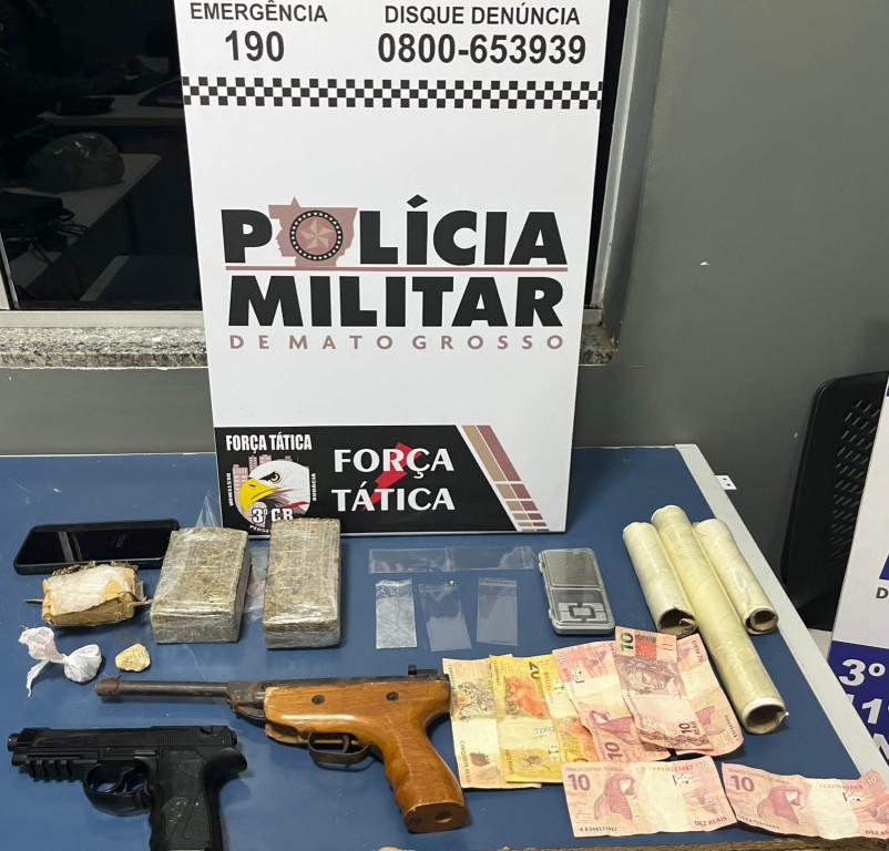 Policiais militares da Força Tática, da 26ª Companhia Independente apreenderam, na noite deste sábado (29.04), duas armas e dois tabletes de substância análogas à maconha, no bairro Parque das Araras, em Sinop. Na ação, um homem foi preso por porte ilegal de arma de fogo e tráfico ilícito de entorpecentes.