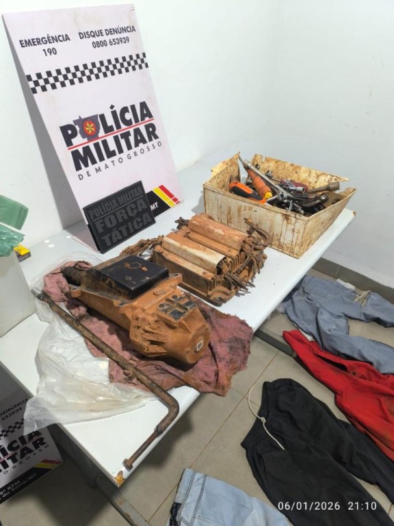 Policiais militares da Força Tática do 7º Comando Regional prenderam três homens faccionados, com idades entre 20 e 26 anos, por furto, na noite desta terça-feira (6.1), em Tangará da Serra. Com os suspeitos, foram recuperados dois módulos de caminhão e caixa com ferramentas.