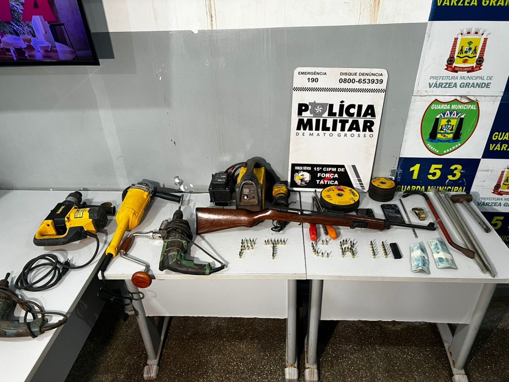 Policiais militares da Força Tática do 2º Comando Regional prenderam três homens, de 24, 27 e 30 anos, por formação de quadrilha e porte ilegal de arma, no final da tarde desta sexta-feira (19.05), em Várzea Grande. Com os suspeitos, a PM apreendeu uma espingarda, 71 munições e ferramentas que seriam utilizadas para cometimento de crimes na cidade.