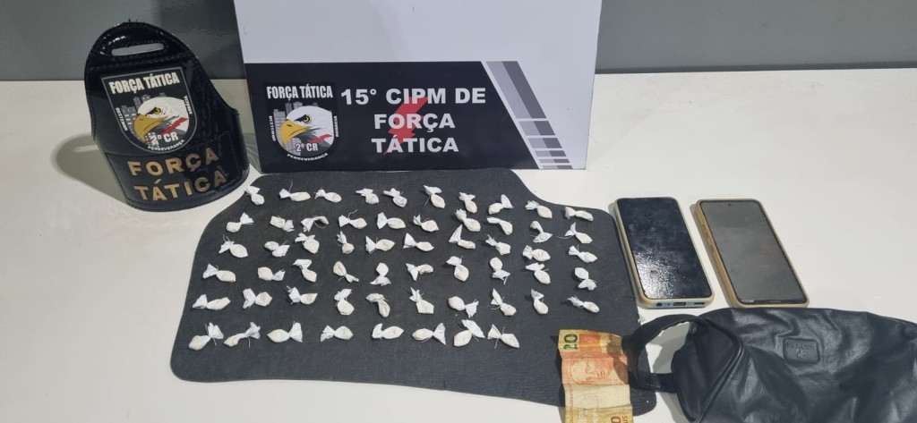 Ao entrarem no local, os militares encontraram os três suspeitos dentro de um quarto. Eles foram abordados e se entregaram aos policiais. No mesmo local, a Força Tática encontrou 58 porções de drogas e a quantia de R$ 20,00 em dinheiro.