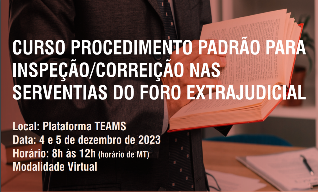 Esta matéria possui recursos de texto alternativo para promover a inclusão das pessoas com deficiência visual. Imagem colorida de homem com roupa escura segurando livro de capa vermelha nas mãos. Ele está virado para a direita. Texto: Curso Procedimento Padrão para Inspeção/correição nas Serventias do Foro Extrajudicial. Local: Plataforma Teams. Data: 4 e 5 de dezembro de 2023. Horário 8h às 12h (horário de MT). Modalidade Virtual.