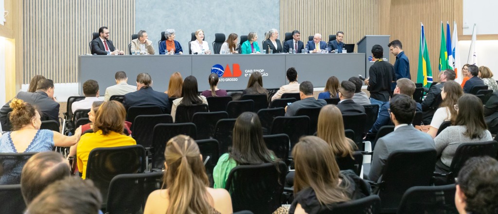 #ParaTodosVerem – Esta matéria possui recursos de texto alternativo para promover a inclusão das pessoas com deficiência visual. Primeira imagem:fotografia colorida registrando o evento na OAB. Em primeiro plano aparece os participantes que estão sentados assistindo o evento. Ao fundo autoridades que compõem o dispositivo de honra.