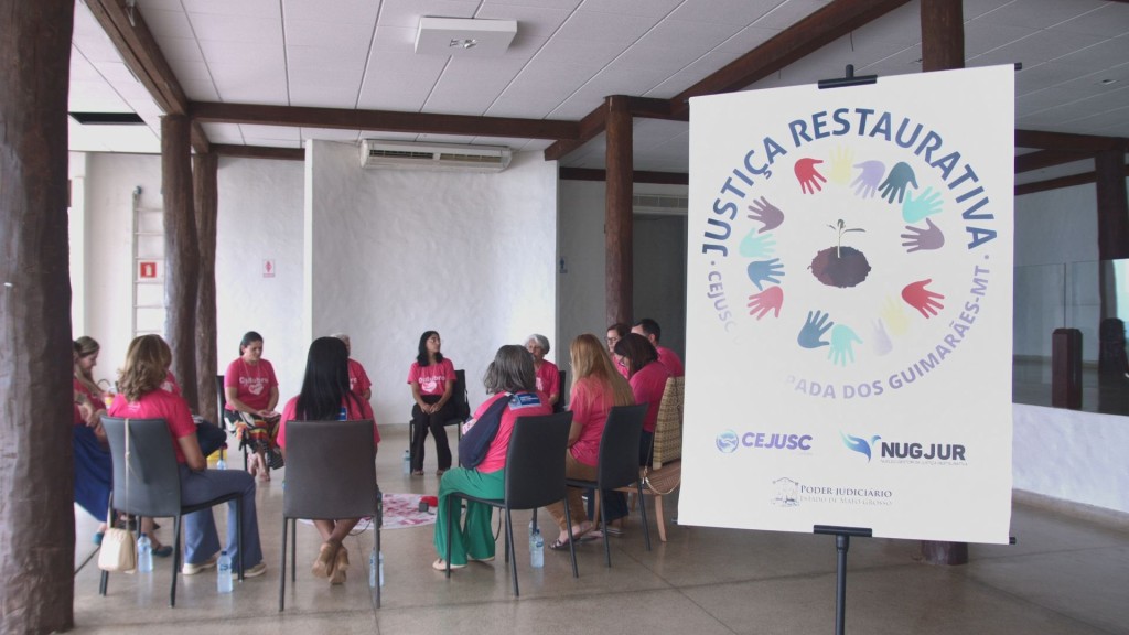 #Paratodosverem. Esta matéria possui recursos de texto alternativo para promover a inclusão de pessoas com deficiência visual. Foto 1: Cerca de 15 pessoas, a maioria mulheres, vestidas com camisetas cor-de-rosa, participam do círculo de construção de paz em uma sala ampla , com paredes brancas e pilares de madeira. No canto direito da foto, está o banner do Cejusc de Chapada dos Guimarães, com o termo “Justiça Restaurativa” em destaque, imagens de mãos coloridas e uma planta brotando da terra ao centro, além das logomarcas do Cejusc, do NugJur e do Poder Judiciário de Mato Grosso. Foto 2: Juiz Leonísio Sales concede entrevista à TV.Jus. Ele é um homem branco, de cabelos curtos e escuros, olhos claros, usando camiseta rosa com estampa do Cejusc no peito. Ao fundo, é possível ver o céu e a vegetação que compõe o cenário de um mirante. Foto 3: Foto em detalhe que mostra algumas participantes durante o círculo. Dentre elas, a primeira-dama de Chapada, Hélia Mello, uma mulher branca, loira e de olhos claros, e a bordadeira Louriza Boabaid, uma mulher branca, de cabelos escuros, lisos e curtos e olhos castanhos escuros.