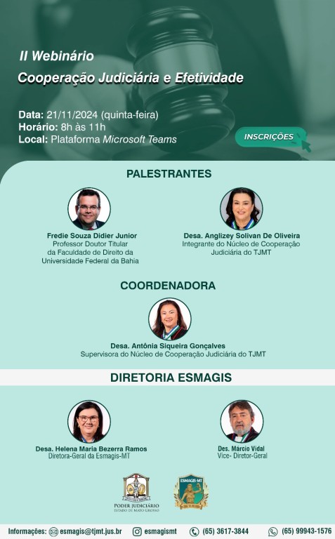 Descrição da imagem: peça publicitária colorida em verde e vertical. Ao fundo, imagem de mão segurando martelo da Justiça. Texto: II Webinário Cooperação Judiciária e Efetividade. Data: 21/11/2024 (quinta-feira). Horário: 8h às 11h. Local: Plataforma Microsoft Teams. Inscrições. Abaixo: informações e fotos sobre os palestrantes Fredie Souza Didier Junior e a desembargadora Anglizey Solivan de Oliveira, da coordenadora desembargadora Antônia Siqueira Gonçalves, bem como dos desembargadores Helena Maria Bezerra Ramos e Márcio Vidal.