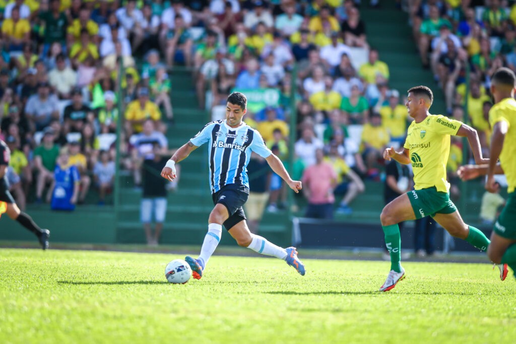 Com menos de sete minutos jogados, já foi possível perceber a superioridade tricolor na primeira etapa do jogo. Apesar da posse de bola ser maior dos donos da casa na primeira etapa, a efetividade foi gremista. Logo aos 5 minutos, o Grêmio chegou com perigo depois de uma grande jogada entre Bitello e Suárez. O meia aproveitou erro adversário e acionou o uruguaio um pouco mais atrás, dentro da área. O camisa 9 finalizou, obrigando grande defesa de Caíque – a bola ainda voltou para o atacante, que mais uma vez tentou concluir, mas sem sucesso.