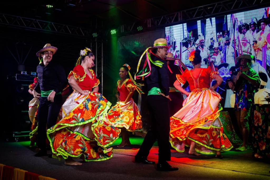 A imagem mostra um grupo de pessoas dançando em trajes típicos coloridos em um palco iluminado. Os trajes incluem saias volumosas e vibrantes com estampas florais, além de chapéus decorados com fitas coloridas. A cena transmite energia, movimento e celebração, em um contexto de dança folclórica. O ambiente sugere um evento cultural ou festa local.