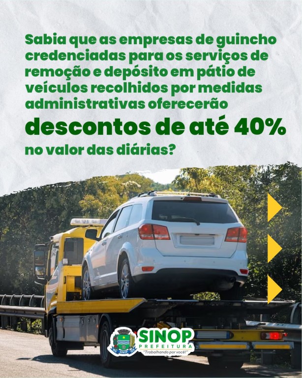 As duas empresas de guincho credenciadas para os serviços de remoção e depósito em pátio de veículos automotores recolhidos por medidas administrativas em Sinop oferecerão desconto de 20 a 40% no valor das diárias. O prazo para aderir a ação vai de 10 de junho a 10 de agosto, e ainda há opção de parcelamento em até 3 vezes no cartão de crédito.