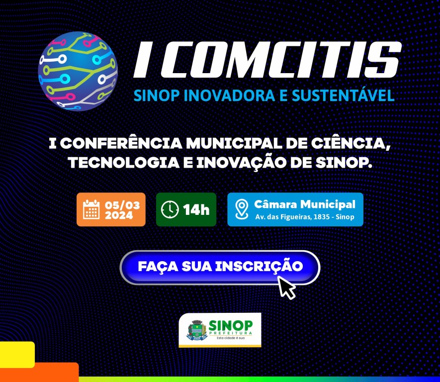 Será realizada hoje (5), a primeira Conferência Municipal de Ciência, Tecnologia e Inovação (COMCITIS), na Câmara Municipal, às 14h. Sinop sediará o evento que vai marcar o início de um novo tempo para o setor, focado no fortalecimento da democratização da inovação e do desenvolvimento tecnológico e sustentável local. A COMCITIS também contará com a participação da comunidade. As inscrições podem ser feitas pelo site oficial da Prefeitura, por meio do link https://sistema.sinop.mt.gov.br/Login/ ou pessoalmente na hora do evento.