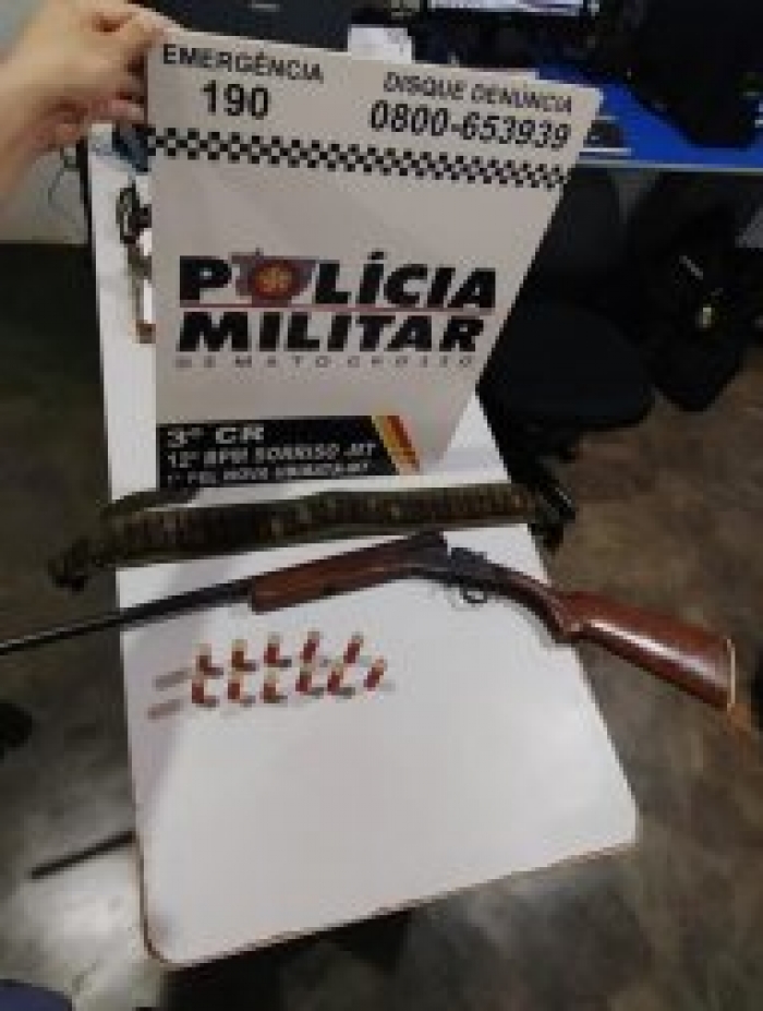 A equipe se deslocou com a vítima foram até a residência do casal. O acusado não estava na casa. Em revista, foram localizadas uma espingarda calibre 28 com 11 munições do mesmo calibre intactas.