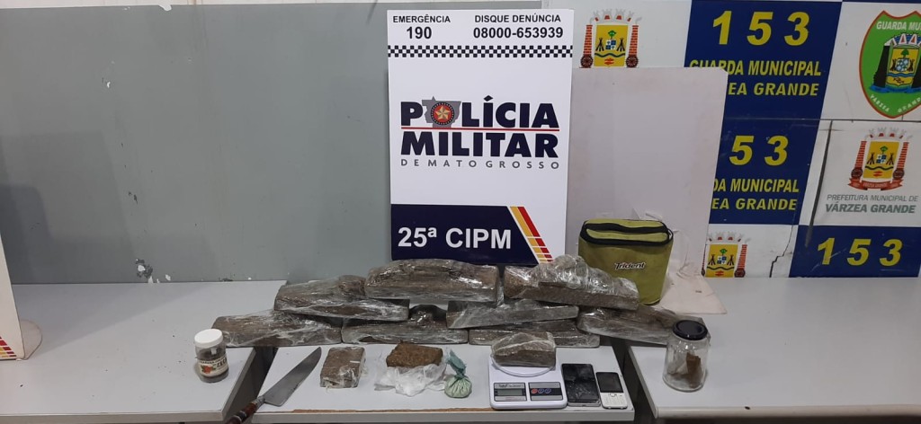 Um homem de 46 anos foi preso em flagrante pela Polícia Militar por tráfico de drogas e corrupção ativa, na noite deste sábado (01.04), em Várzea Grande. Com o suspeito, a PM apreendeu oito tabletes e outros pedaços de substância análoga à maconha.