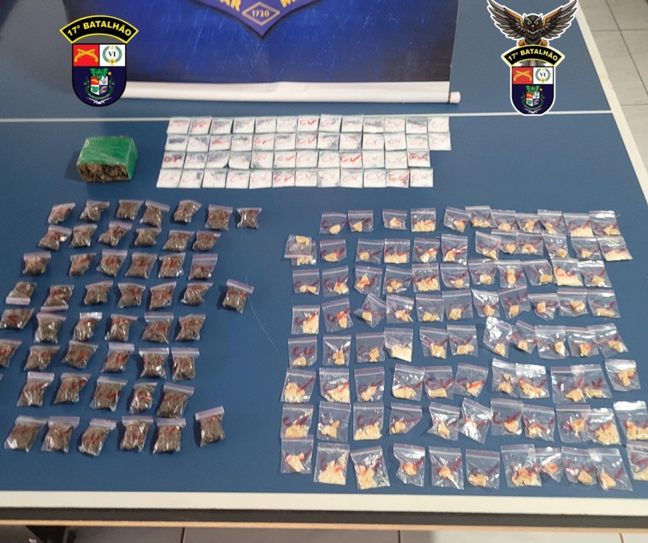 Dentro do imóvel, os militares localizaram 90 porções de pasta base, 51 porções de cocaína, 50 porções de maconha skunk e 1 porção grande maconha. Todo o material foi localizado escondido no guarda-roupas do suspeito.