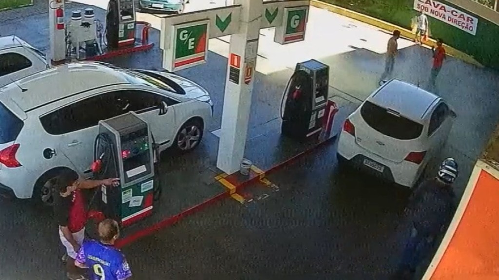 Em seguida, como mostra o vídeo, é possível ver o frentista apontando a mangueira de combustível na direção do cliente. Depois, ele corre atrás de Caio com um isqueiro para atear fogo nele.