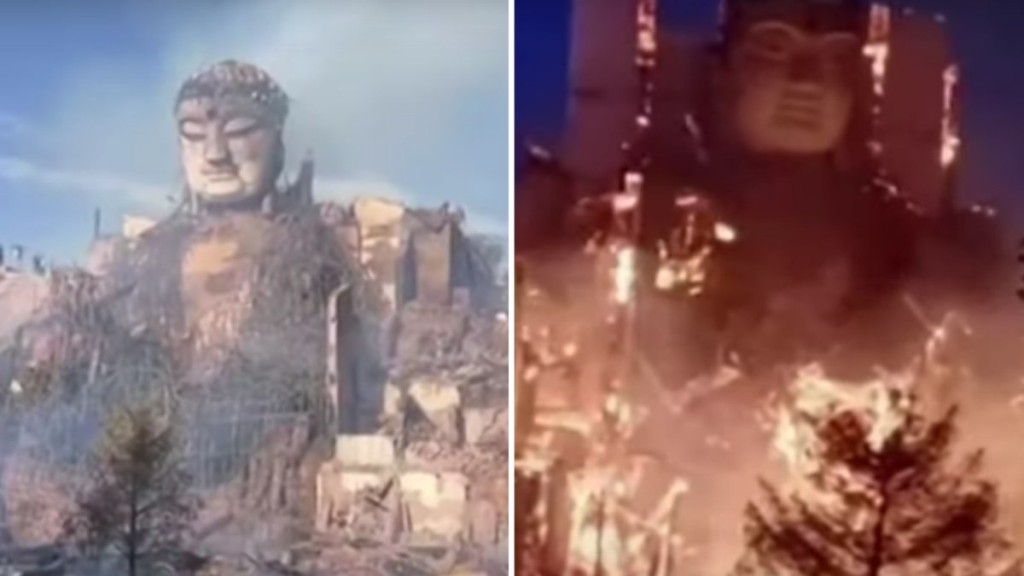 Vídeos compartilhados nas redes sociais mostram uma estátua de Buda queimando e, após o fogo ser apagado, o monumento continuou parcialmente intacto, em meio às cinzas. Várias estruturas do templo, porém, foram destruídas.