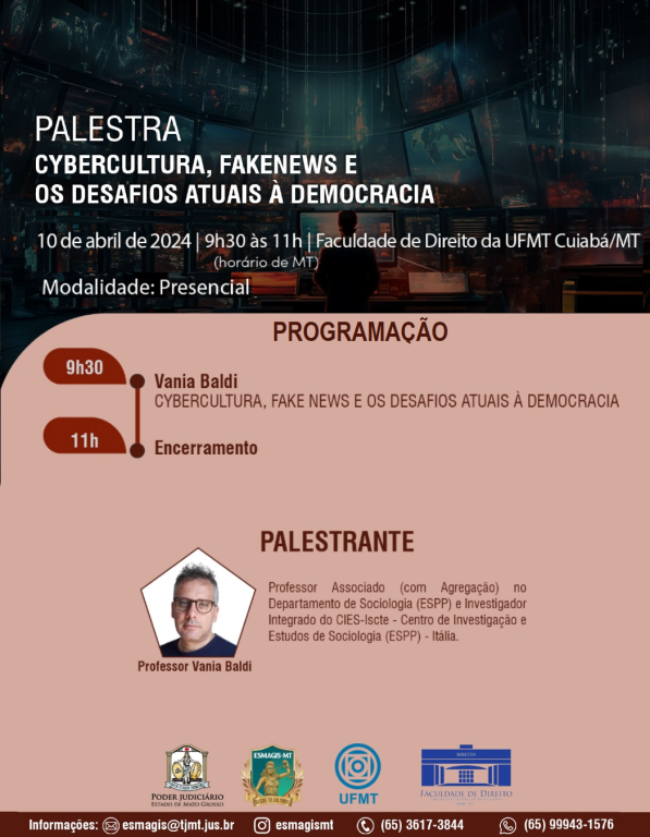 ‘Cybercultura, Fake News e os Desafios Atuais à Democracia’ são os temas que serão debatidos em palestra na manhã desta quarta-feira (10/04), das 9h30 às 11h, na Sala de Mestrado do Programa de Pós-Graduação de Direito da Universidade Federal de Mato Grosso. O curso está com as inscrições abertas é voltado para magistrados, servidores, assessores e estagiários (link no fim da matéria). Ao todo, são ofertadas 50 vagas.