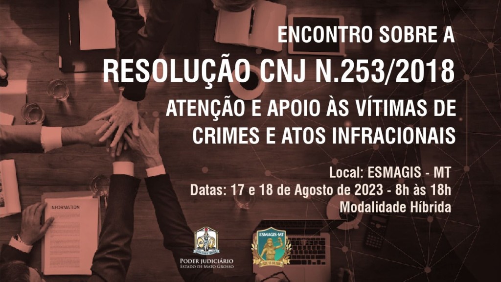 Esta matéria possui recursos de texto alternativo para promover a inclusão das pessoas com deficiência visual. Descrição das imagens: Foto 1 – imagem retangular colorida. Pessoas com a mãos sobrepostas em ato de parceria. Sobre a mesa papéis e computadores. Texto: Encontro sobre a Resolução CNJ n. 253/2018 – Atenção e apoio às vítimas de Crimes e Atos Infracionais. Local – Esmagis-MT. Datas 17 e 18 de agosto. 8h às 18h. Modalidade híbrida. A peça é assinada pelos logos do Poder Judiciário e da Esmagis.