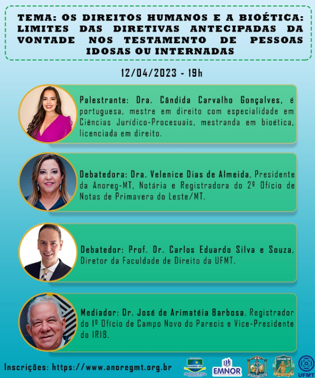 Atuarão como debatedores a presidente da Anoreg-MT, Velenice Dias de Almeida, que é notária e registradora do 2º Ofício de Notas de Primavera do Leste (MT), e o professor doutor Carlos Eduardo Silva e Souza, diretor da Faculdade de Direito da Universidade Federal de Mato Grosso (UFMT).