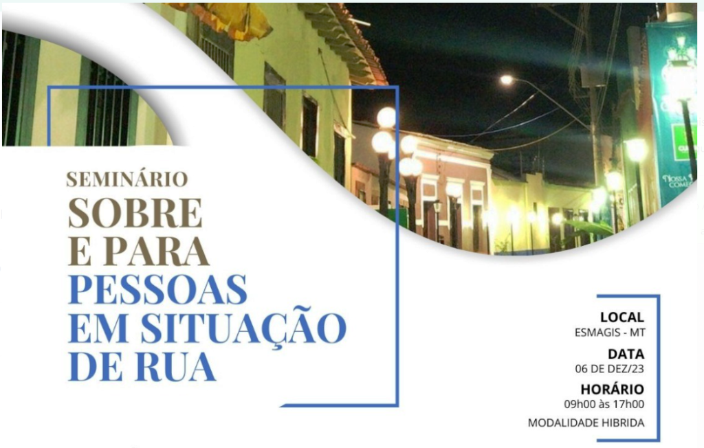 Prosseguem abertas as inscrições para o “Seminário sobre e para pessoas em situação de rua”, que será realizado na próxima quarta-feira (6 de dezembro), das 8h às 18h (horário de Cuiabá), em formato híbrido (presencial e videoconferência).