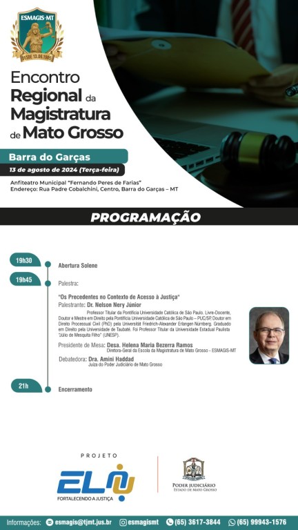 Estão abertas as inscrições para a nova edição do “Encontro Regional da Magistratura de Mato Grosso”, que desta vez será sediado em Barra do Garças, no dia 13 de agosto. A iniciativa da Escola Superior da Magistratura de Mato Grosso (Esmagis-MT) contará com palestra do professor doutor Nelson Nery Júnior sobre “Os Precedentes no Contexto de Acesso à Justiça”.