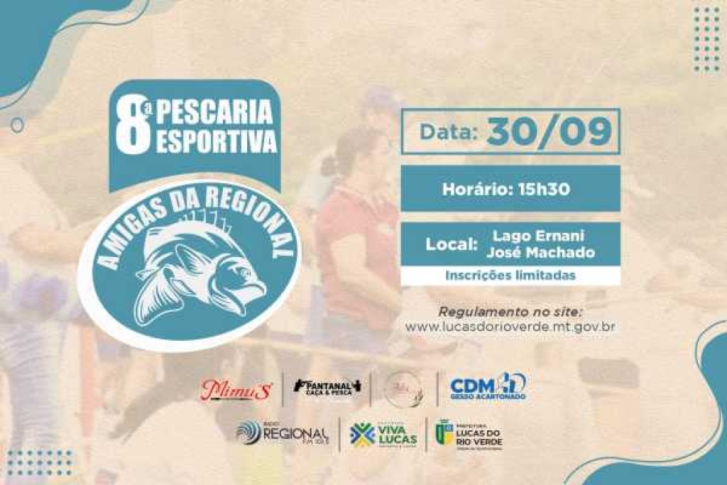 A Prefeitura de Lucas do Rio Verde informa que estão abertas as inscrições para 8ª Pescaria Esportiva das Amigas da Regional. O evento, que é promovido pela Secretaria de Esporte e Lazer, está de volta após três anos e será realizado no dia 30 de setembro, às 15h30, no Lago Municipal Ernani José Machado.