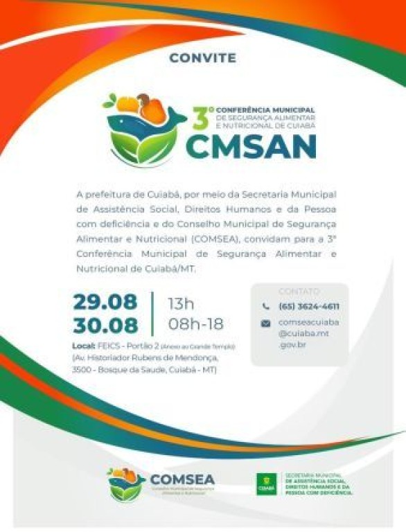 A Prefeitura de Cuiabá, por meio da Secretaria Municipal de Assistência Social, Direitos Humanos e da Pessoa com Deficiência e Conselho Municipal de Segurança Alimentar e Nutricional, informam que, as inscrições para a 3ª Conferência Municipal estão abertas. Com o tema ‘Erradicar a fome e garantir direitos com comida de verdade, democracia e equidade’, o encontro ocorrerá nos dias 29 e 30 de agosto. A abertura oficial será às 13h, no auditório das Faculdades Evangélicas Integradas Cantares de Salomão (FEICS), Portão 2 (Anexo ao Grande Templo). O segundo e último dia da Conferência ocorrerá em período integral.