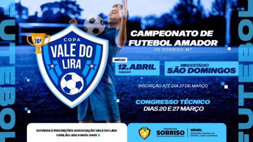 A Prefeitura Municipal de Sorriso, por meio da Secretaria de Esporte, Lazer e Juventude, realizará a Copa Vale do Lira 2025, que terá início no dia 12 de abril. O torneio de futebol amador acontecerá no Miniestádio São Domingos e promete movimentar o cenário esportivo da cidade.