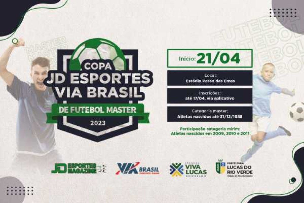 A Prefeitura de Lucas do Rio Verde, por meio da Secretaria de Esporte e Lazer, lançou, nesta sexta-feira (17), a Copa JD Esportes / Via Brasil de Futebol Master. As inscrições já estão disponíveis e podem ser feitas até o dia 17 de abril, pela internet.