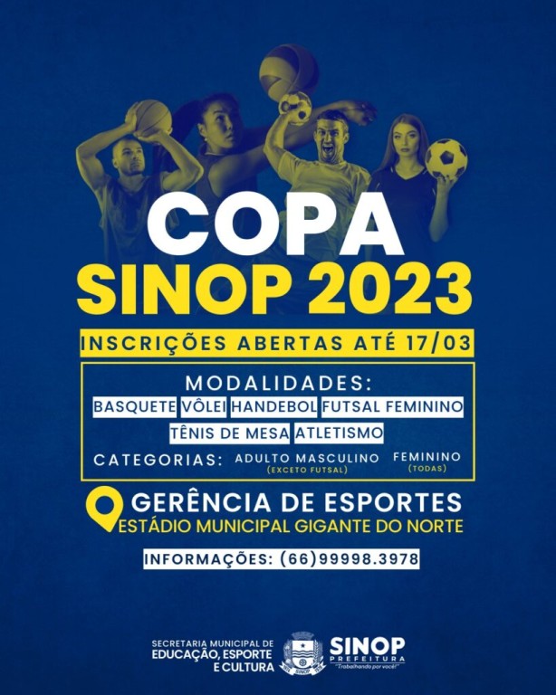 As incrições para a Copa Sinop 2023 estão abertas e seguem até essa sexta-feira, dia 17 de março. Os atletas podem se inscrever nas modalidades de handebol, vôlei, basquete, atletismo, tênis de mesa e futsal. Conforme o calendário, haverá programação mensal a partir deste mês até dezembro. Vale destacar que as inscrições são gratuitas, para as categorias adulto masculino (exceto futsal) e adulto feminino (todas as modalidades).
