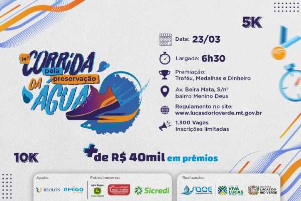 A partir de quinta-feira (30), estarão abertas as inscrições para a 14ª Corrida pela Preservação da Água. O evento esportivo em comemoração ao Dia Mundial da Água é uma realização do Serviço Autônomo de Água de esgoto – SAAE, em parceria com a Prefeitura de Lucas do Rio Verde, por meio da Secretaria de Esporte e Lazer.