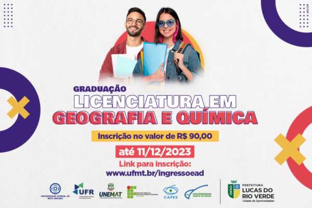 Seguem abertas as inscrições para o processo seletivo Nº 028/2023, para vagas remanescentes dos cursos de Licenciatura em Química e em Geografia. Ambos os cursos são ofertados pela Universidade Federal de Mato Grosso (UFMT), por meio da Pró-reitora de Ensino de Graduação (PROEG) na modalidade a distância pela Universidade Aberta do Brasil (UAB) – polo Lucas do Rio Verde, em parceria com a Secretaria de Tecnologia Educacional (Setec/UFMT).