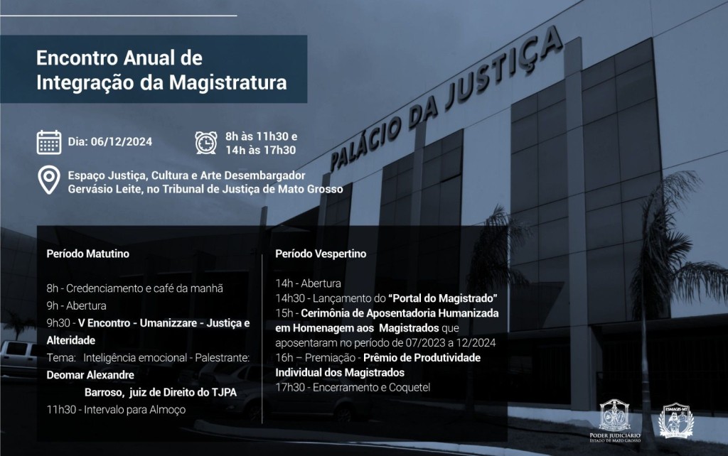 Integração da Magistratura – A palestra integra o Encontro Anual da Integração da Magistratura, realizado em parceria com a Coordenadoria de Magistrados. No período vespertino, a programação é fechada para público convidado.