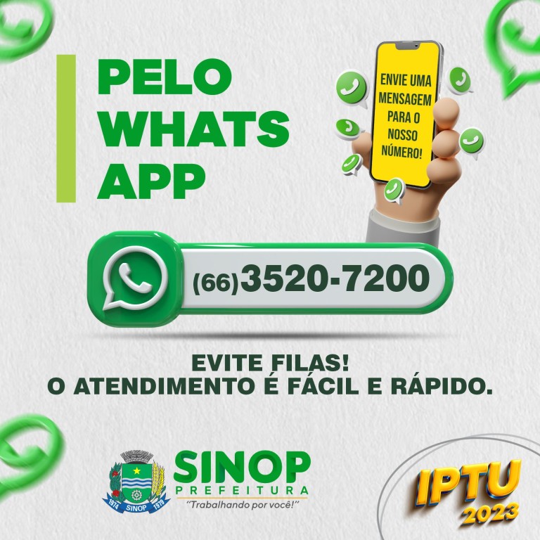 A retirada do boleto para pagamento do IPTU e da taxa de lixo, pode ser realizada pelo WhatsApp, pelo número (66) 3520-7200 ou pela internet.
