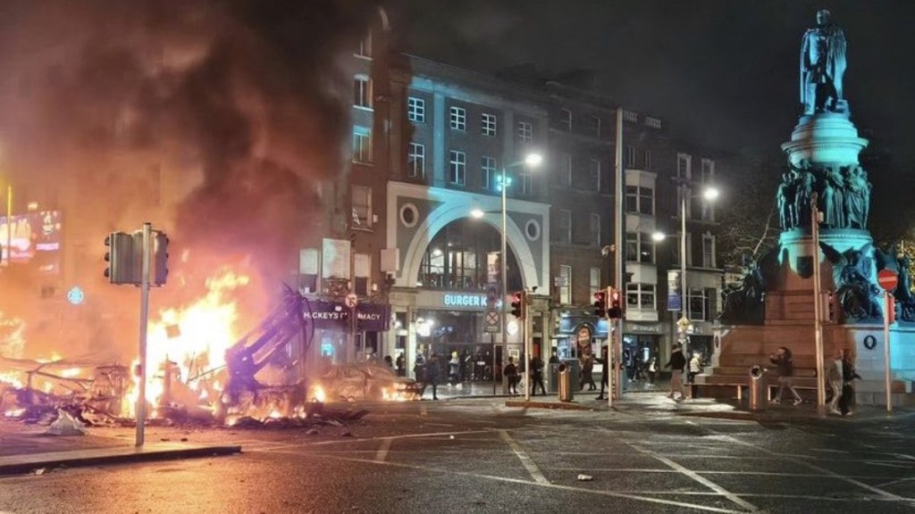 Uma multidão invadiu as ruas da capital irlandesa durante a noite da última quinta-feira (23), e ônibus e carros de polícia foram queimados. Segundo a autoridades, ao menos 34 pessoas foram detidas e um policial foi internado em estado grave após ser atacado.