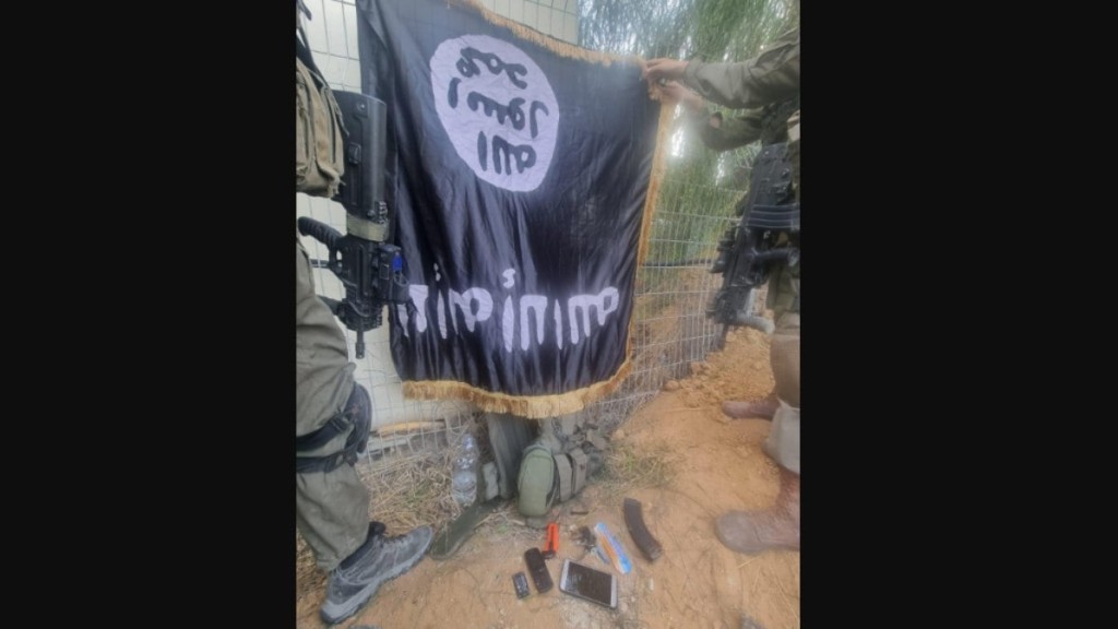 O exército de Israel afirmou nesta quinta-feira (12) que encontrou uma bandeira do Estado Islâmico (ISIS, na sigla em inglês) em meio a equipamentos de membros do Hamas no kibutz Sufa, perto da fronteira com Gaza.