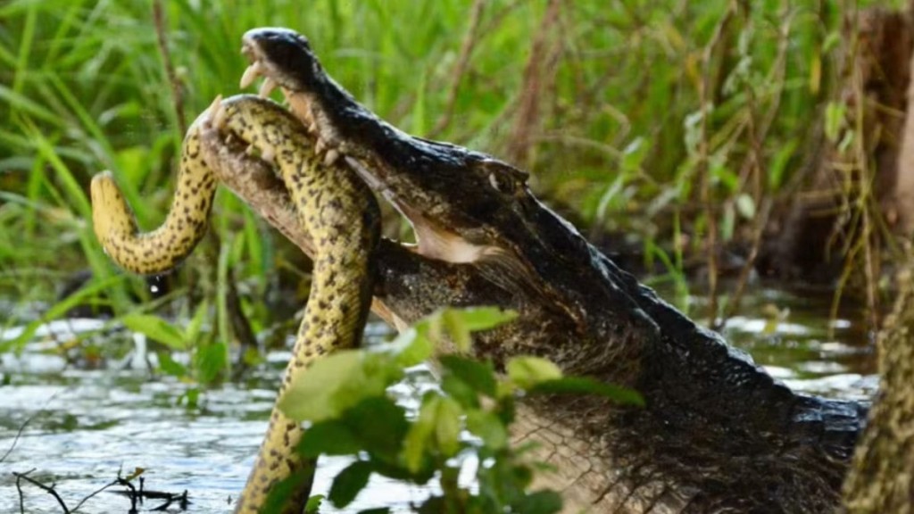 Imagens surpreendentes mostram a luta entre animais silvestres. Uma briga entre um jacaré e uma sucuri está entre os duelos mortais que a natureza proporciona. Veja: