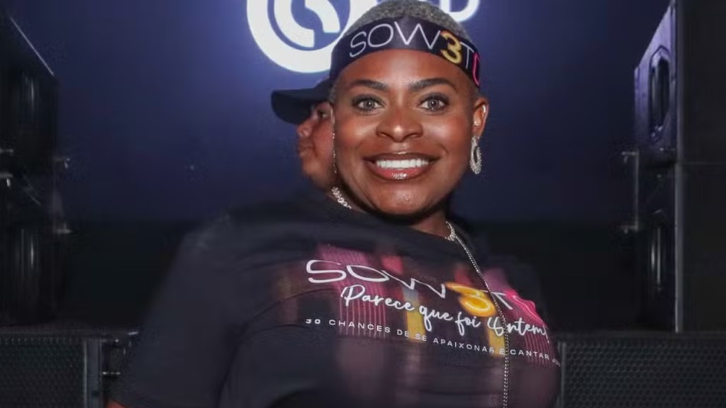 A cantora usou faixa na cabeça e camiseta do grupo de pagode. A artista, que emagreceu mais de 50 kg após uma cirurgia de redução do estômago, deixou a barriga de fora, evidenciando a nova silhueta.