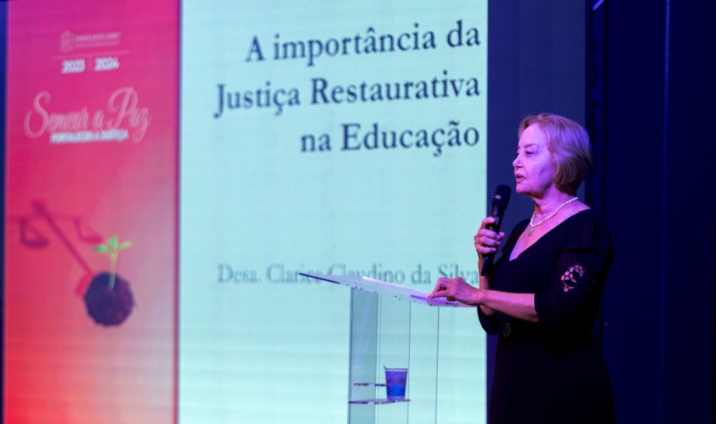 #ParaTodosVerem – Esta matéria possui recursos de texto alternativo para promover a inclusão das pessoas com deficiência visual. Foto 1: A imagem mostra a desembargadora Clarice Claudino falando ao microfone e olhando para a platéia. Atrás dela está um enorme painel azul com o nome do evento “Jornada da Educação 2024”. No painel está um telão com o seguinte texto da palestra “E ao aprendizado de outras crenças. Cultura da Paz. A violência é evitável; é possível lidar com a violência sem violência; o ser humano tem uma natureza solidária e compassiva; a paz se aprende.