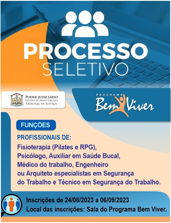 Primeira imagem: Arte gráfica com os letterings ‘Processo Seletivo’ na parte superior. Marcas do Poder Judiciário de Mato Grosso/Tribunal de Justiça e do Programa Bem Viver no centro do design. Na parte inferior, as funções discriminadas para as vagas disponibilizadas no texto da matéria. No rodapé está o período e o loca das inscrições.