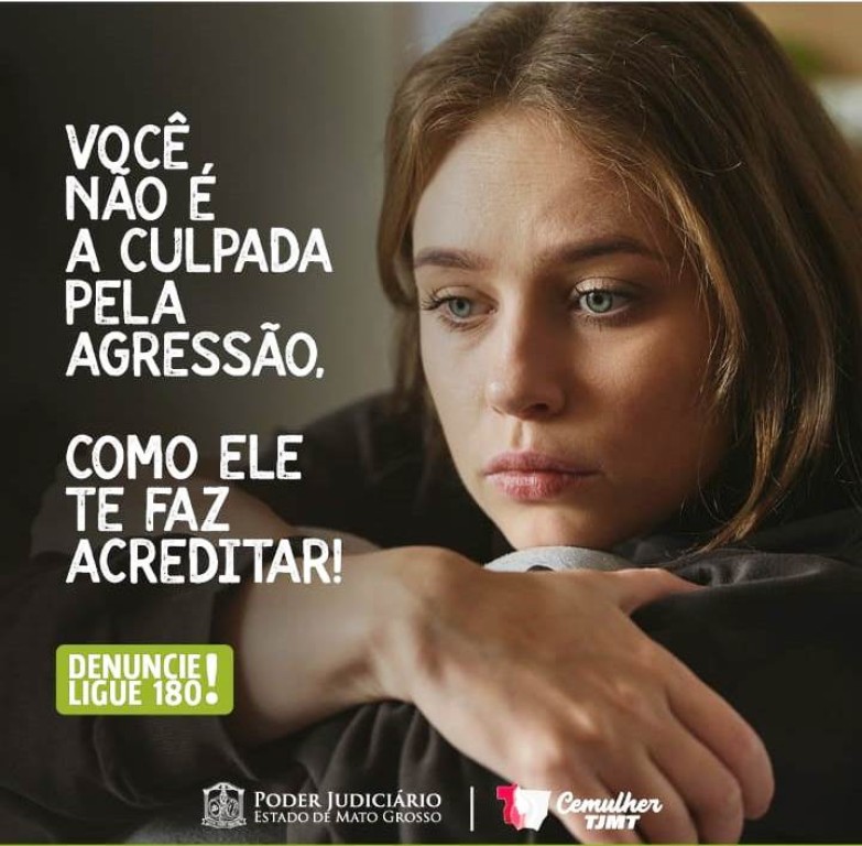 #Paratodosverem. Esta matéria possui recursos de texto alternativo para promover a inclusão de pessoas com deficiência visual. Foto 01: Arte contendo a frase “Você não é culpada pela agressão como ele te faz acreditar!” em caixa alta. No terço direito da arte, há uma mulher em close up, abraçando os seus joelhos e com olhar reflexivo e triste. Logo abaixo está escrito “Denuncie! Ligue 180!”, no rodapé estão as logomarcas de Poder Judiciário e da Cemulher TJMT.